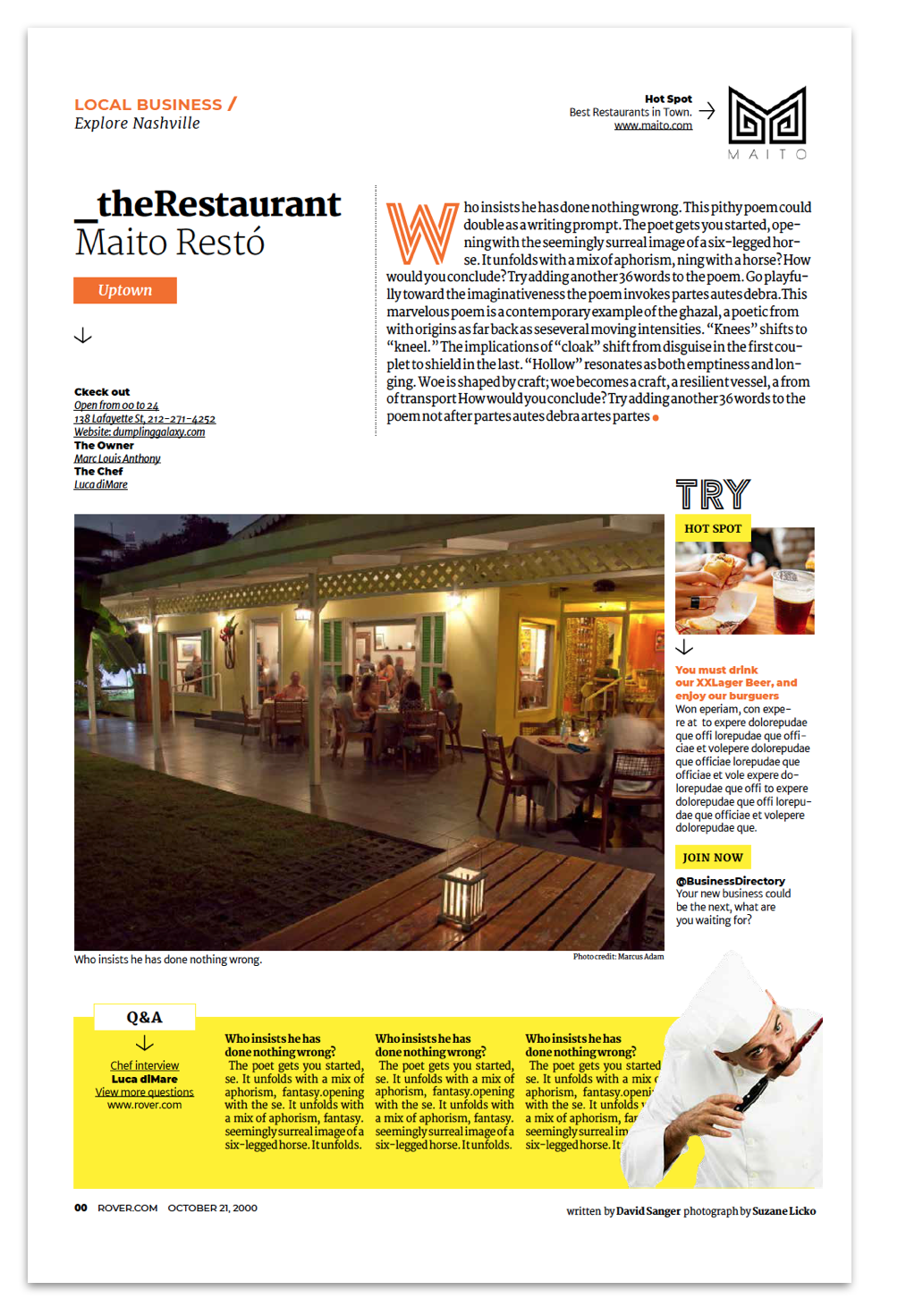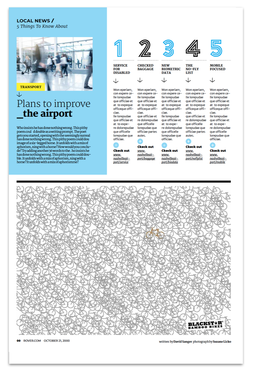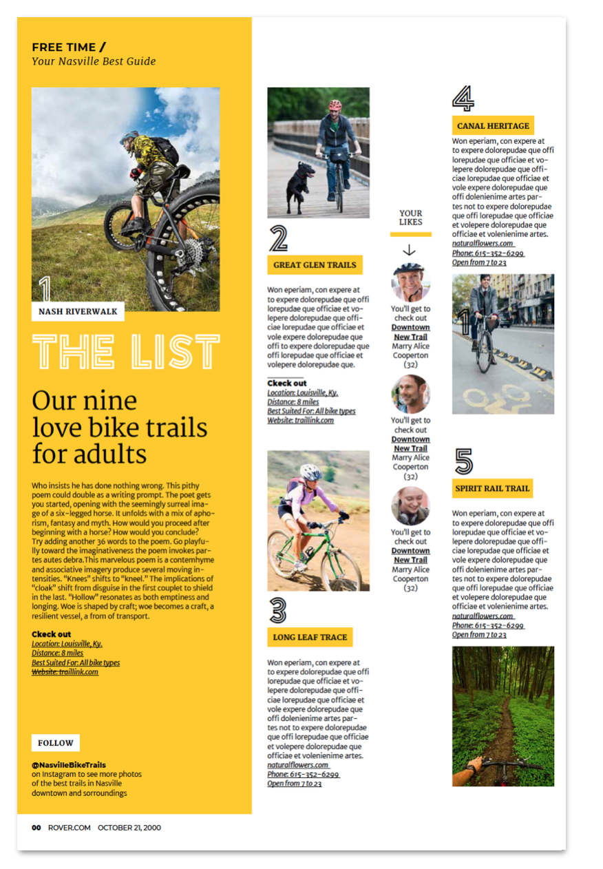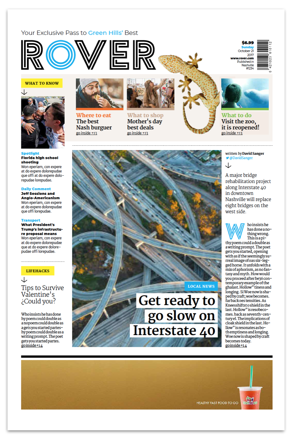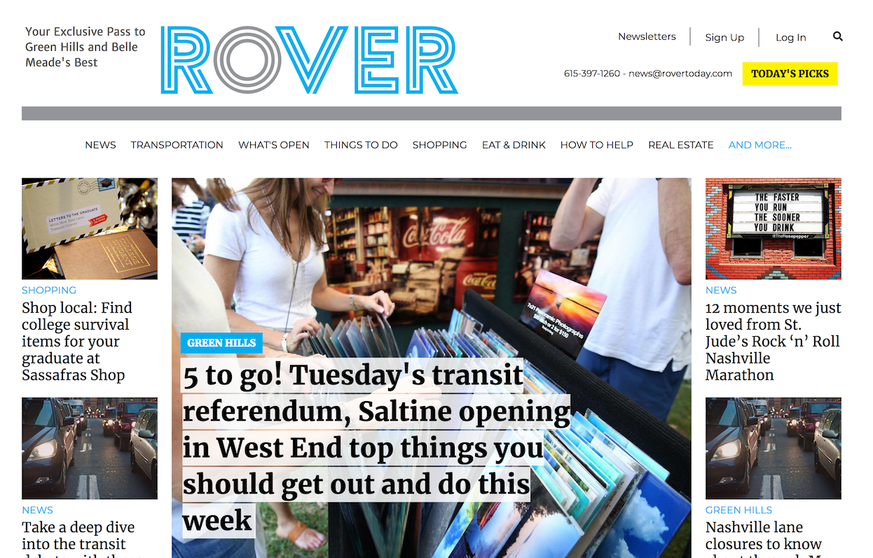 Para el desarrollo de la publicación Rover, editada por la empresa American Hometown Publishing, Mario García, trabajó muy próximo a David Arkin (Chief Content Officer) y al equipo de García Media Latinoamérica, Paula Ripoll y Rodrigo Fino. Los informes detallados y las disucusiones que les siguieron lograron un proceso dinámico y fluido de intercambio de ideas que son imprescindibles para el desarrollo de una publicación hiperlocal como lo es, en este caso Rover, para la ciudad de Nashville (EE.UU).