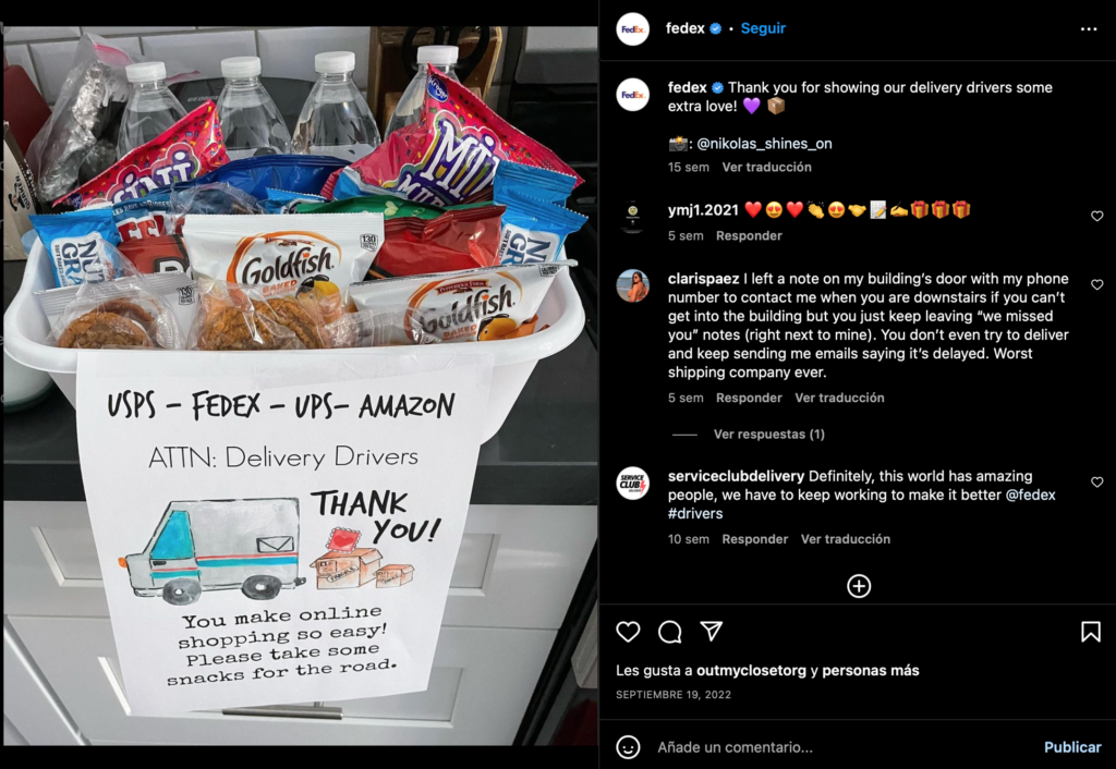 FedEx ,la empresa de logística internacional, también puede contar una historia. El hecho de entregar paquetes a un país en cualquier parte del mundo le ha dado un posicionamiento como marca sólida y permanente. Ahora bien, ¿en dónde está el diferencial de su estrategia? Las historias en el siglo XXI son historias compartidas, en donde los propios usuarios son una parte fundamental de la comunicación y que muchas veces son poco conocidos, como este usuario que agradece en el canal oficial de Fedex en Instagram a todos aquellos que le entregan sus paquetes a diario (y no solo a los de Fedex) regalándole un pequeño refrigerio para que siga con sus entregas.