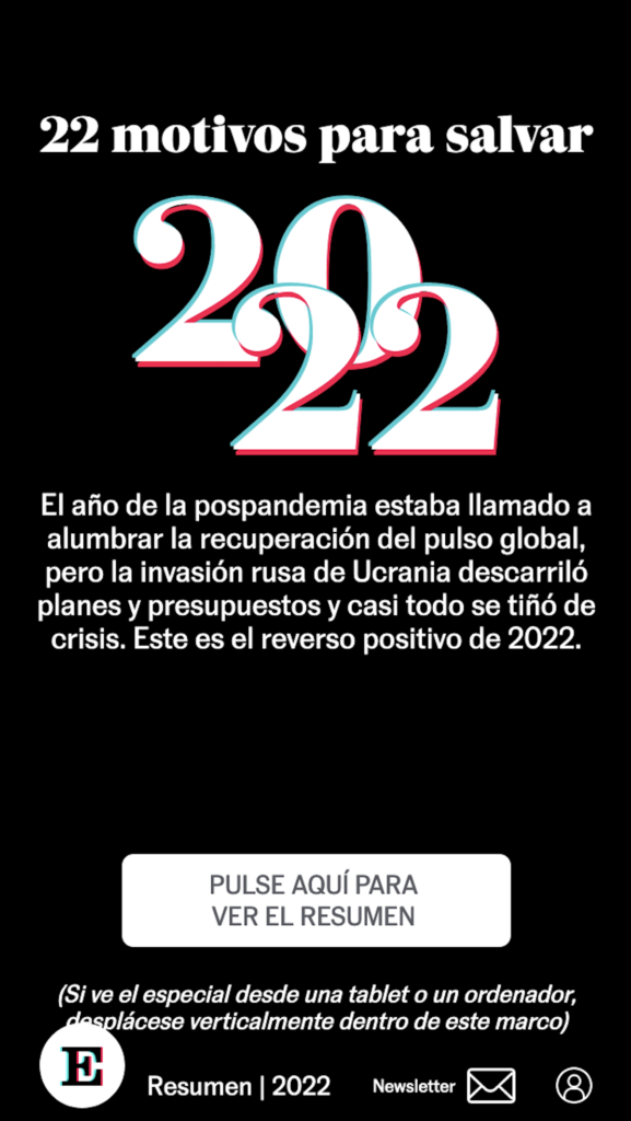 Un buen ejemplo de estas nuevas formas de narrativas que no están exentas de una construcción informativa y periodística es 22 motivos para salvar el 2022, desarrollada por elpais.com en formato web storie.