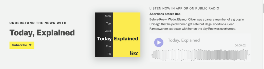 Nuevas herramientas, nuevos lenguajes y posibilidades y, en este contexto, a veces es mejor contemplar varias opciones posibles para desarrollar una narrativa de calidad. Ampliar las posibilidades del contenido trae como resultado un mayor alcance. El sitio informativo Vox, con una gran combinación de newsletter, podcast, contenido escrito y contenido en video hace un diferencial importante. Incluso la incorporación de un podcast explicativo de los temas más importantes del día le dan la posiblidad al usuario de tener otra textura informativa.